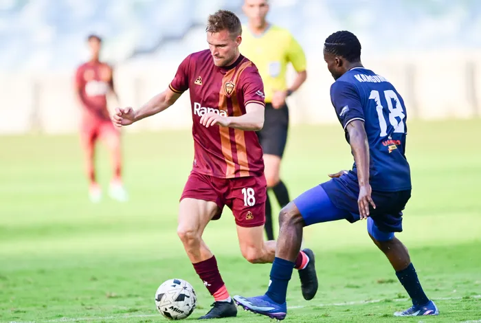 Andre de Jong of Stellenbosch FC is challenged by Reagan Kangumbu of Nsingizini Hotspurs FC during their CAF Confederation Cup 2024/25 second leg game at Moses Mabhida Stadium in Durban yesterday. Photo: Gerhard Duraan/BackpagePix