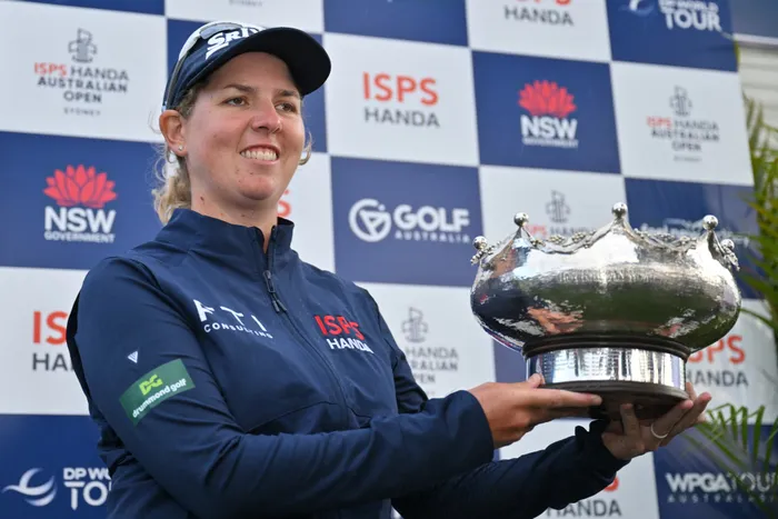 South Africa’s Ashleigh Buhai posses with the trophy after defending her Australian Open title. Picture: Saeed Khan / AFP