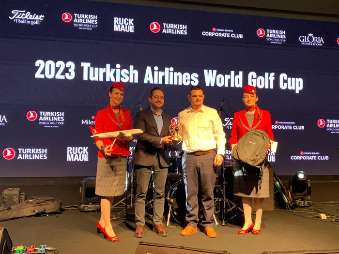 South African Bertus Schaap (centre right) receives his long drive prize at the Turkish Airlines World Golf Cup Amateur Series Grand Finals at the Gloria Golf Resort South African Bertus Schaap (centre right) receives his long drive prize at the Turkish Airlines World Golf Cup Amateur Series Grand Finals at the Gloria Golf Resort on Friday. Picture: Zaahier Adams