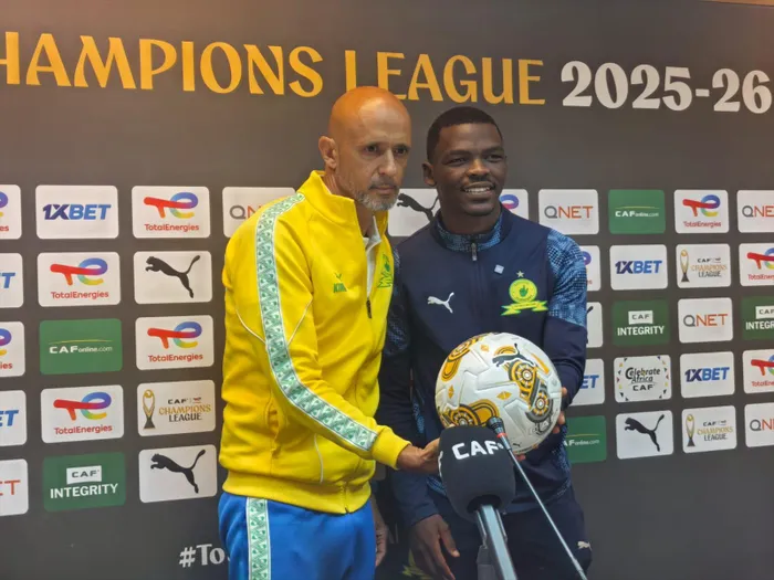 Mamelodi Sundowns coach Miguel Cardoso and on form Tsiki Ntsabeleng during the pre-match press conference ahead of facing Esperance de Tunis in the Caf Champions League semi-final first leg in Tunisia.