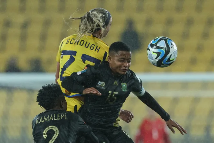 Banyana Banyana captain Refiloe Jane heads a ball during 2023 Fifa Women’s World Cup against Sweden. Banyana Banyana captain Refiloe Jane will not be part of the squad for the Paris Olympics qualifier against the Tanzania. Picture: Marty Melville / AFP