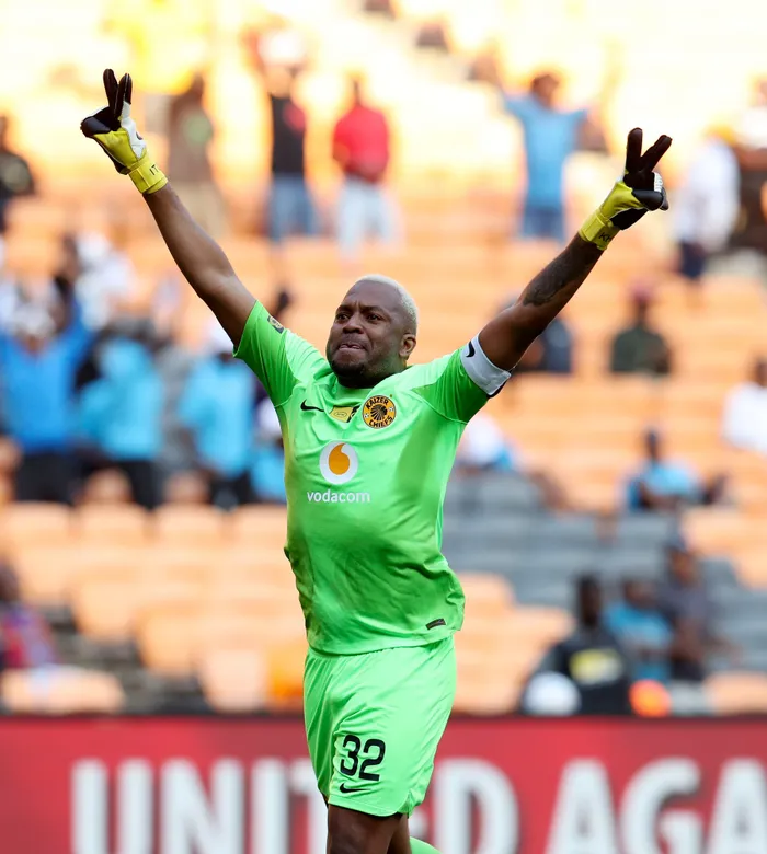 a soccer goalkeeper dressed in a green kit salutes the crowd Itumeleng Khune of Kaizer Chiefs during the 2022 MTN8 semi-final match against AmaZulu at the FNB Stadium, Johannesburg on the 02 October 2022. Picture: Muzi Ntombela/BackpagePix