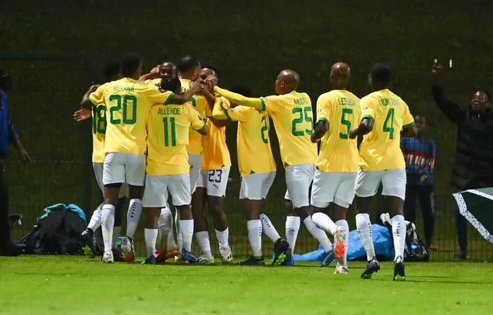 Lucas Ribeiro celebrates with teammates after scoring Mamelodi Sundowns’ goal during their DStv Premiership match against AmaZulu Lucas Ribeiro celebrates with teammates after scoring Mamelodi Sundowns’ goal during their DStv Premiership match against AmaZulu at King Zwelithini Stadium in Durban on Wednesday. Photo: Gerhard Duraan/BackpagePix