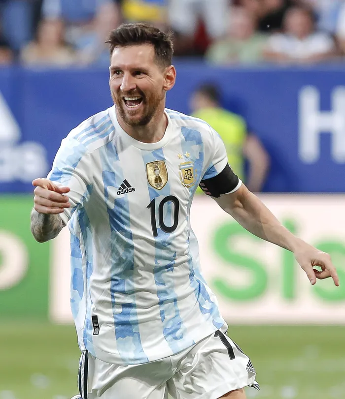 epa09997972 Argentina's Lionel Messi celebrates after scoring the 3-0 lead during the International Friendly soccer match between Argentina and Estonia at El Sadar stadium in Pamplona, Spain, 05 June 2022. EPA/Villar Lopez