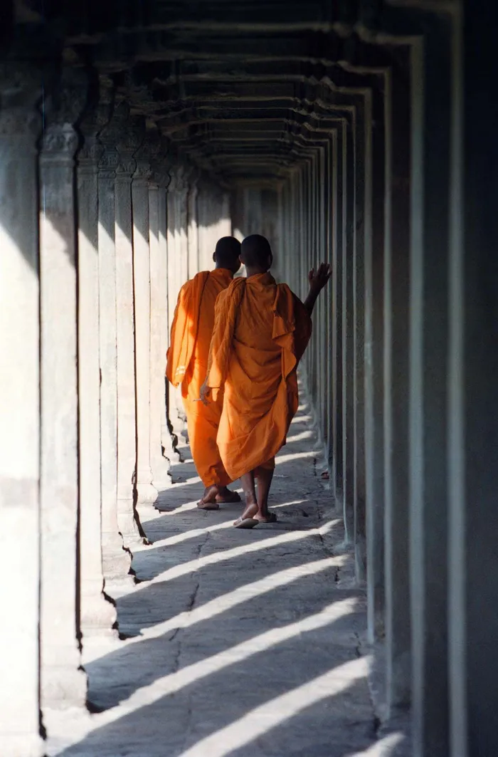 Cambodian Buddhist monks walk along the terrace of the ancient temple of Angkor Wat in Siem Reap. Picture: Darren Whiteside/REUTERS