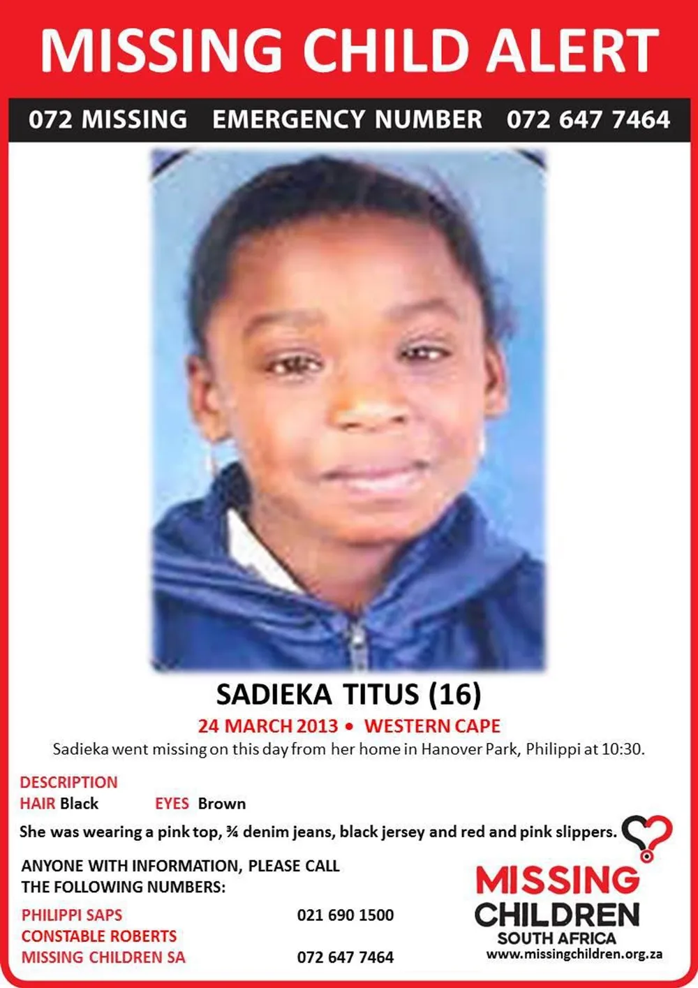 The case record reads: “On 16 October, 1999 she and some friends apparently went to Bonteheuwel. Later in the evening, her mother called family and family friends, as she was concerned about her whereabouts, as she had not returned from Bonteheuwel. When her mother could not trace her, she decided to report her disappearance at the Philippi police station. The response from the police was that maybe she was having a good time with her friends.