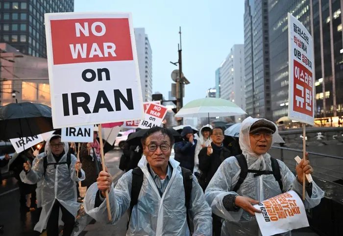 Protesters carry placards reading "No war on Iran!" as they march toward the US embassy during a rally condemning the US and Israeli attacks on Iran in Seoul on March 5, 2026