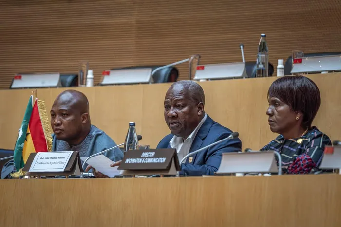 John Dramani Mahama (centre), President of the Republic of Ghana, addresses a press conference on the theme “Ancestral Debt, Modern Justice: Africa’s Unified Case for Reparations” during the 39th Ordinary Session of the Assembly of the African Union at the AU Headquarters in Addis Ababa on February 15, 2026.